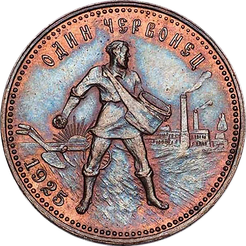 Реверс: содержит изображение крестьянина-сеятеля на фоне плуга, восходящего солнца и заводов. Над фигурой крестьянина-сеятеля надпись: ОДИН ЧЕРВОНЕЦ. Снизу слева – год чеканки монеты. Кант по всей окружности также украшен точечным орнаментом.