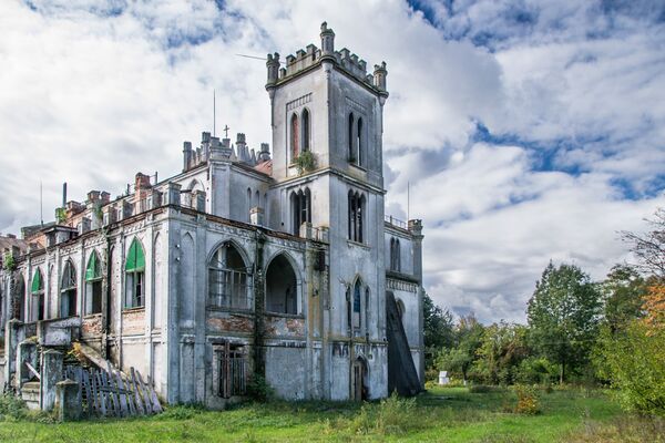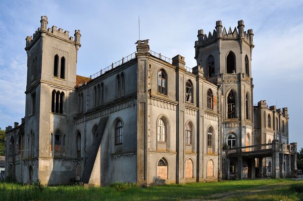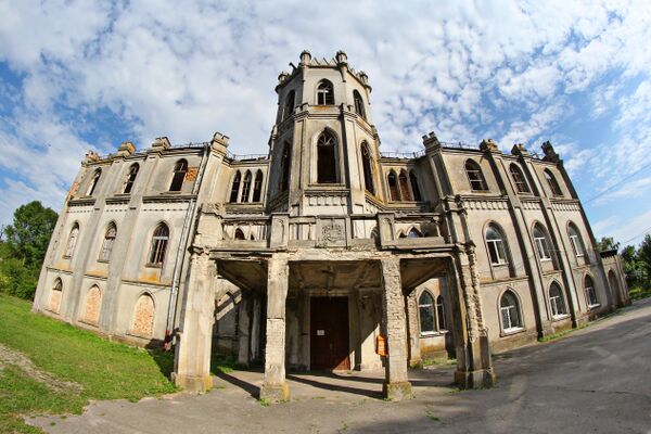 Здание выполнено в стиле английской неоготики. Архитектор здания — не известен. Изначально дворец насчитывал три этажа и был симметричным четырёхугольником с башней на главном фасаде, а также двумя башнями по бокам здания. Дворец был окружен парком с садами общей площадью 58 га. Парк имел два озера и островок с беседкой.