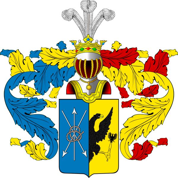 Щит разделён перпендикулярно на две части, из них в правой в голубом поле изображены крестообразно три серебряные Стрелы без перьев, обращённые остриями: крайние две вниз, а средняя вверх (изм. польский герб Елита), связанные посередине красными Черевами. В левой части в золотом поле виден до половины чёрный одноглавый Орёл с распростёртым крылом имеющий в лапе Скипетр.