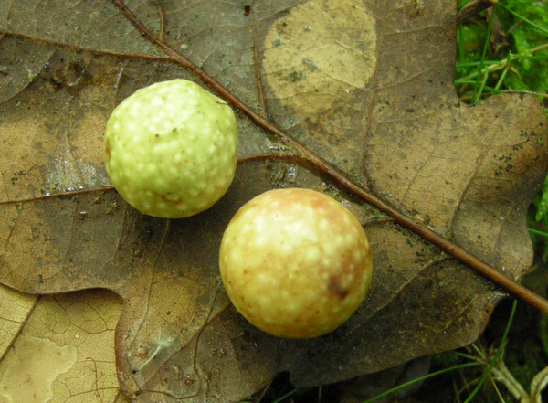 Чернильные орешки — частный вид галлов, образуемых личинками ряда насекомых семейства орехотворок (Cynipidae)[1] на молодых ветвях и листьях некоторых видов дуба (Quercus). Представляют собой пористые образования округлой или продолговатой формы в виде наростов диаметром 1,5—2 сантиметров и более. Чернильные орешки могут «гроздью» покрывать поражённые листья. Содержат дубящие вещества (до 70 % от сухой массы). По окраске могут быть зеленовато-желтоватые, желтовато-белые, желтоватые, часто с красным боком. Из-за своей формы и окраски в английском языке они получили название «дубовых яблок» (англ. Oak apple)[2].