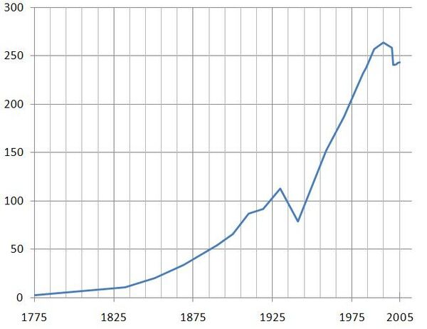 | Год | 1775 | 1794 | 1832 | 1851 | 1869 | 1890 | 1900 | 1910 | 1919 | 1930 | 1941 | 1959 | 1970 | 1982 | 1984 | 1989 | 1995 | 2000 | 2001 | 2002 | 2003 | 2004 | 2005 |