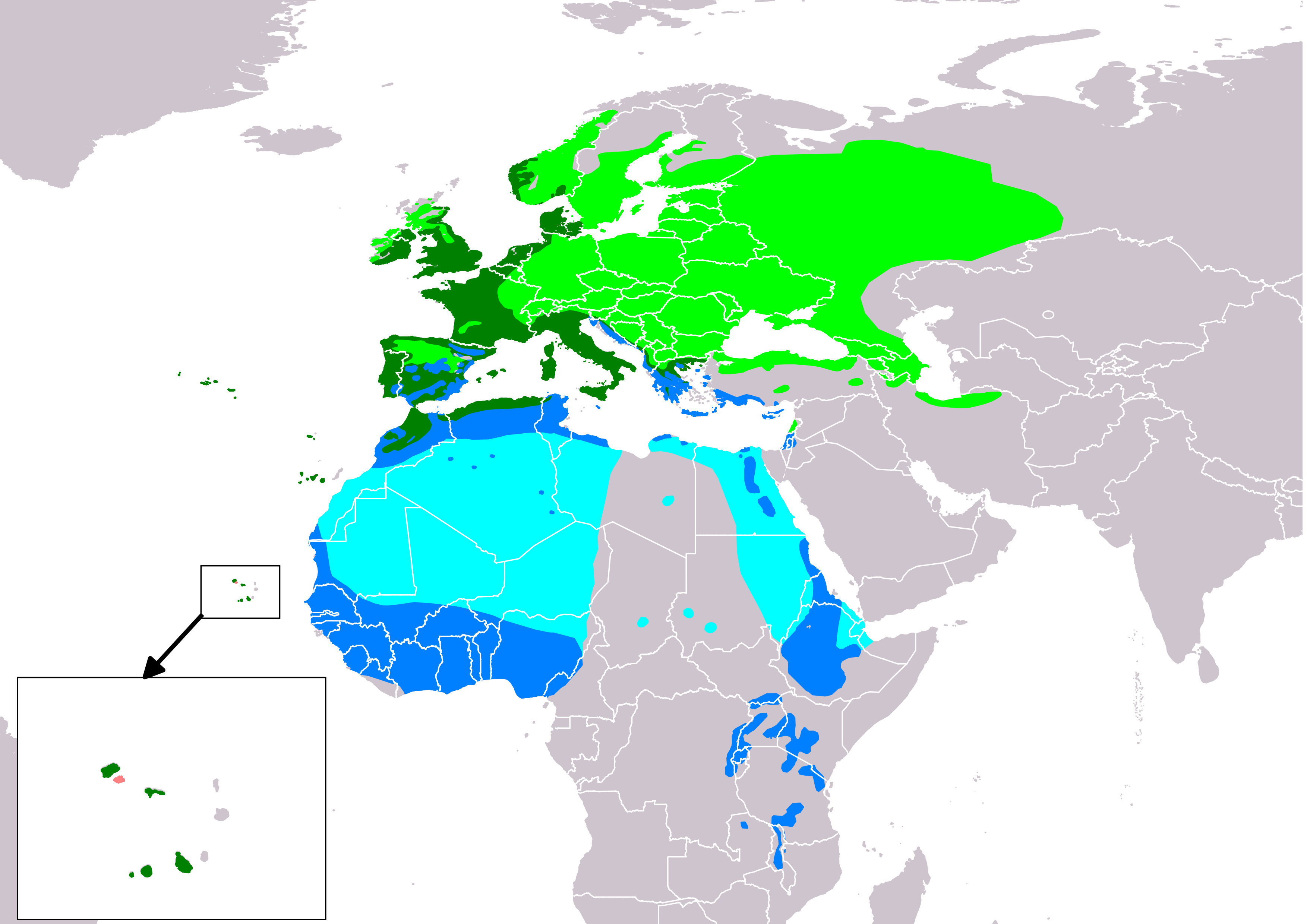 Славка-черноголовка распространена по всей Европе, кроме Крайнего Севера, заходит в Западную Сибирь. Гнездится также на северо-западе Африки и Канарских островах.