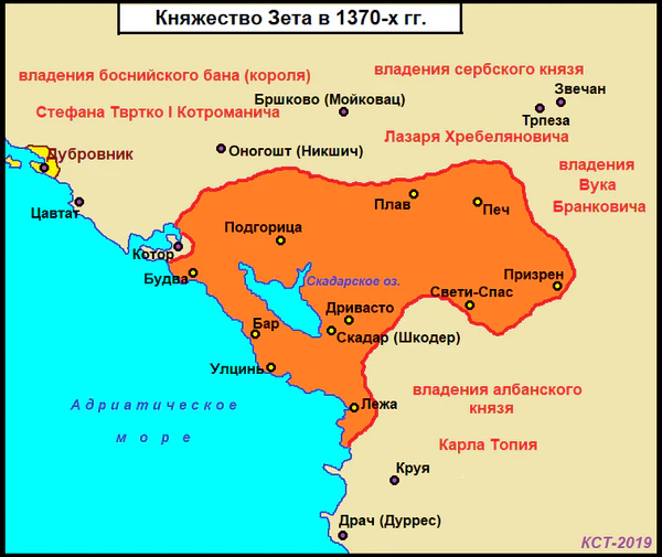 Дукля добилась освобождения от Византии при князе Стефане Воиславе, во второй половине XI века включала в себя большинство сербских земель (в том числе Рашку и Боснию) и вскоре распалась. К 1186 году завершился процесс вхождения земель бывшей Дукли в Рашку, находившейся под правлением династии Неманичей; присоединённый регион получил название Зета. Княжество Зета стало независимым во второй половине XIV века, но уже в 1421 вошло в состав Сербского деспотата. В 1444 году над территорией Зеты был установлен венецианский протекторат. В 1496―1499 регион был захвачен Османской империей и включён в Шкодринский санджак, при этом приморские города (Бар, Улцинь, Котор и Будва) остались под контролем Венецианской республики[16].