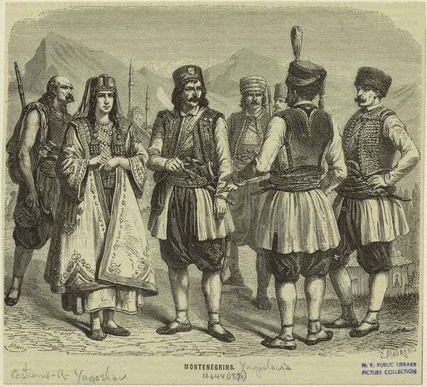 Мужская одежда состояла из белой рубахи, заправлявшейся в синие шаровары до колен (черног. димије), опоясанных широким шёлковым поясом, гетр (черног. докољенице), жилетов-безрукавок (черног. јелек, џамадан,последний мог быть также и с рукавами), душанки (черног. душанка) — своего рода жилета с откидными рукавами, и длинных суконных кафтанов (черног. долама), (черног. гуњ). Женщины носили длинную туникообразную белую рубаху, поверх неё — юбку (черног. сукња, раша), опоясанную поясом филигранной работы из серебра,часто с позолотой (черног. ћемер), передник (черног. прегача), суконный или бархатный жакет (черног. јакета), по праздникам — шитый золотом жилет с короткими рукавами (черног. долактица) и длинное распашное платье из белого сукна и без рукавов, украшенное на углах и по краям (черног. корет). Зимой оба пола носили струку (черног. струка) — длинный плащ с капюшоном, который помимо своей основной функции — защиты от осадков мог служить в качестве одеяла-пледа. Головным убором служила капа — круглая фетровая шапочка с чёрным околышем и красной тульёй, вышитой золотыми нитями; мужчины также носили меховые шапки, украшенные перьями, а замужние женщины надевали поверх кос чёрную шёлковую вуаль (черног. вел). Обувью служили опанки — кожаные башмаки, надеваемые на носки (черног. чарапе), у мужчин — также сапоги, зимой пастухи и охотники носили деревянные снегоступы (черног. крпље). Схожие костюмы носило население приграничных областей Сербии, Герцеговины (юго-восток современной Боснии и Герцеговины) и хорватской Далмации[10][11].