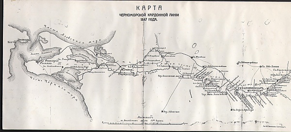 В 1830-х годах многие пограничные поселения, в том числе город Екатеринодар, были огорожены палисадами, а по углам защищены крепостными орудиями. В это время кордонная линия заключала 31 пост и делилась на 4 части, простираясь по почтовой дороге на 265 верст, от поста до поста — на 321 версту, а по извилинам берега Кубани — до 400 верст[4]. Извилины Кубани образуют с обеих сторон мысы, называемые кутами, низкие, болотистые, поросшие лозой, густым, высоким камышом и осокой, что часто облегчало неприятелю возможность скрываться от внимательного взгляда сторожевых. По мере надобности число укреплений увеличивалось, пространство между ними охранялось все большим числом батарей и пикетов; в конце существования Черноморской кордонной линии число постов и батарей простиралось до 60, а пикетов было более 100[5]. Черноморская кордонная линия сначала входила в состав правого крыла кавказской линии; в 1830 г. она с Фанагорией составляла правое крыло этой линии, а в 1833 г. выделена была в особый участок — Черноморию, которая простиралась от Геленджика и крепости Анапы вверх по Кубани до границы Кавказской области, в 17 верстах ниже устья Лабы; дальше вверх по Кубани до Хумаринского укрепления шел правый фланг.