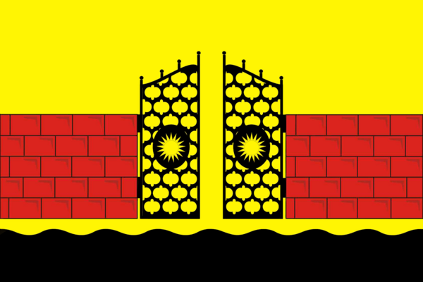 В золотом поле с чёрной волнистой оконечностью, червлёная, мурованная чёрным стена с чёрными же приоткрытыми воротами, створки которых украшены золотыми солнцами, по одному на каждой.Сайт Геральдика.ру[39]