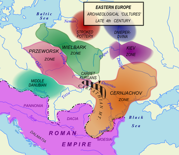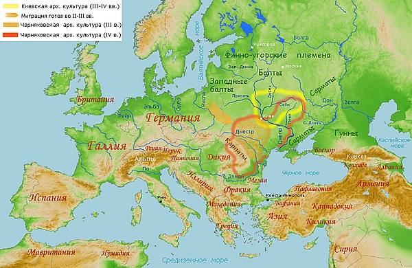 Черняховская культура по времени и географии совпадает с государством Ойум, основанным готами в начале III в. н. э. и уничтоженным гуннами в конце IV века. Однако большинство исследователей считает, что черняховская культура была полиэтничной. Мнение о такой многоэтничности черняховской культуры основывается, главным образом, на наличии существенных локальных особенностей в домостроительстве, керамике и погребальном обряде её носителей. В складывании культуры приняли участие различные этнические элементы, а сама она явилась продуктом определённой культурно-экономической и политической обстановки, общей для ряда этнических групп[5].