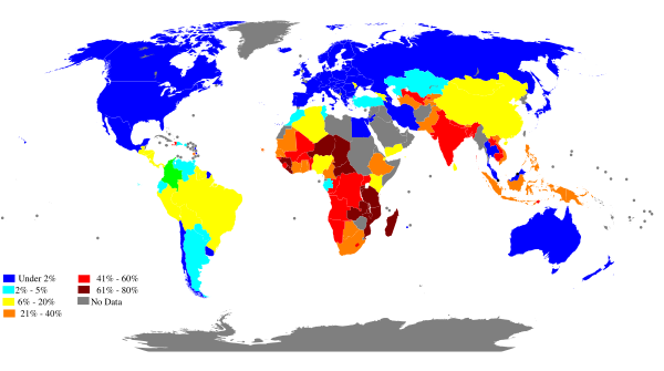 На конец 2020 года численность живущих на менее чем 2,15 долларов в день составила 719 миллионов человек в мире; при общем населении Земли 7,8 миллиардов человек. Для сравнения в 1990 году около 2 миллиардов человек на Земле жила в нищете; при населении Земли 5,3 миллиарда человек.[8] Количество бедных в мире имеет тот же порядок цифр, что и количество голодающих, которых насчитывается около 828 миллионов человек в 2023 году. [9]