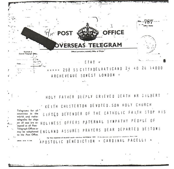 Проповедь на панихиде Гилберта Честертона в Вестминстерском соборе, проходящей 27 июня 1936 года, читал Рональд Нокс. Нокс сказал: «Всё наше поколение выросло под влиянием Честертона настолько, что мы даже не замечаем, когда начинаем думать о нём»[33]. Также Нокс стал автором эпитафии на надгробии Честертона:
