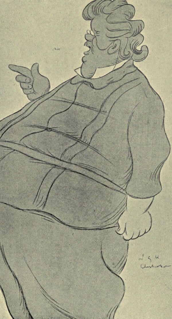 Гилберт Кит Честертон обладал крупной фигурой: рост писателя составлял 1 метр 93 сантиметра, вес — 130 килограммов. Его обхват талии породил знаменитый анекдот: во время Первой Мировой Войны к Честертону подходит дама и спрашивает «Почему вы не на фронте?», на что Честертон отвечает: «Если вы зайдёте со стороны, то увидите, что я вполне себе там»[27]. В другой раз между писателем и Джорджем Бернардом Шоу произошёл следующий диалог[28]: