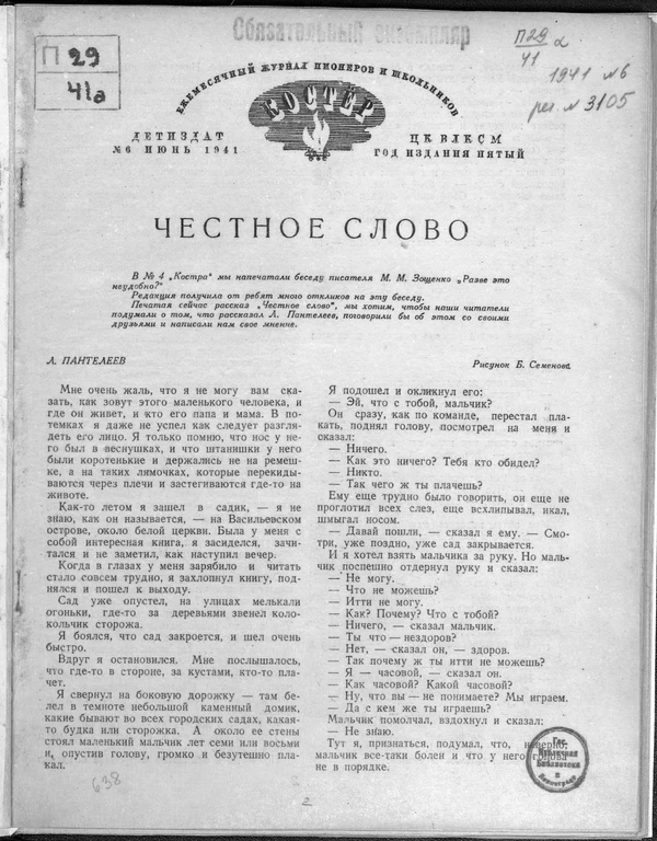 - Л. Пантелеев. Честное слово : Рассказы : Для младш. возраста. — Москва ; Ленинград : Детгиз, 1943. — 72 с.