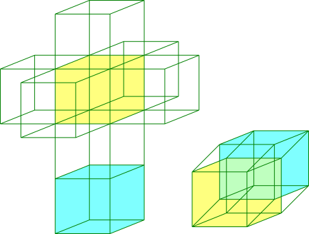 Четырёхмерное пространство можно также представить как бесконечное количество трёхмерных пространств, расположенных по четвёртой оси координат, так же, как трёхмерный мир состоит из бесконечного количества двумерных плоскостей, размещённых вдоль третьей оси.