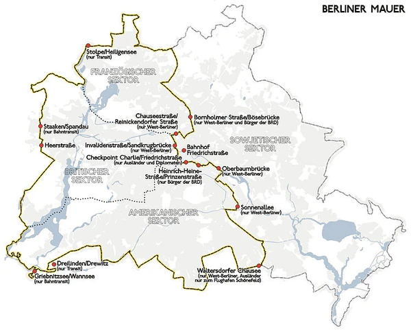 C 1954 года жителям западных секторов оккупации Берлина был запрещён вход в советскую зону оккупации Германии, где в 1949 году была провозглашена Германская Демократическая Республика, но передвижение внутри оккупационных секторов Берлина для граждан третьих стран оставалось беспрепятственным вплоть до возведения ГДР 13 августа 1961 года Берлинской стены, разделившей город на Западный и Восточный Берлин. В 1971 году было заключено Четырёхстороннее соглашение по Западному Берлину, урегулировавшее практические вопросы раздела города. Секторы оккупации Берлина существовали вплоть до объединения Германии, то есть по 2 октября 1990 года включительно.