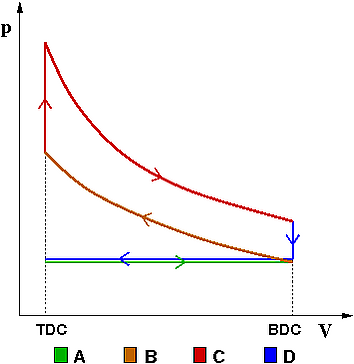 - Рабочий ход 360—540° кривошипа — движение поршня в сторону нижней мёртвой точки под давлением горячих газов, передаваемого поршнем через шатун коленчатому валу. В двигателе Отто при этом происходит процесс изохорного расширения, в дизеле за счёт продолжающегося горения рабочей смеси подвод теплоты продолжается столько, сколько длится впрыск порции топлива. Поэтому сгорание в дизеле обеспечивает процесс, близкий к адиабатному, расширение происходит при одинаковом давлении.