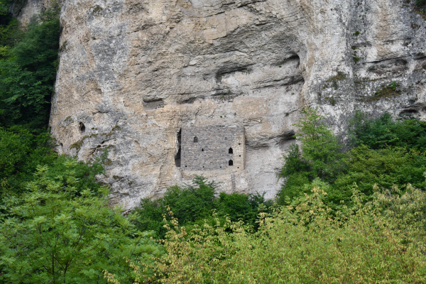 К замку ведет узкая, частью высеченная в скале карнизом тропа, кое-где обрывающаяся и заменённая деревянными мостками. Тропа ведет к низким, скорее похожим на окно, воротам, находящимся в остатках стены. Ворота ведут в небольшой двор, расположенный на естественном выступе, образуемом утесом. Двор со всех сторон обнесен стеною, частью обрушившейся. Налево параллельно с отвесным утёсом внутри двора тянется стена, образующая жилище, которому левой стеной служит скала. Выше виднеются остатки двух башен, прикрепленных к навесу, образуемому утёсом. На значительном пространстве скала покрыта копотью, свидетельствующей о том, что некогда в этой ужасной твердыне жили люди. Но поразительное впечатление производит небольшой балкон, сохранившийся каким-то чудом на страшной высоте. Некогда, когда замок возвышался во всем своем суровом величии, к балкону вела лестница, которая обрушилась с крутизны вниз, как и стены башен. В настоящее время балкон висит одиноким свидетелем прошлого и нет к нему никакого доступа. Держится он на массивных деревянных брусьях, выступающих на сажень из скалы[1].