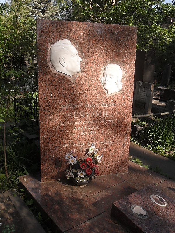 - в 1989 году[источник не указан 2989 дней] в Москве (Котельническая набережная, 1/15). Надпись на доске гласит, что «В этом доме с 1963 года по 1981 год жил Герой Социалистического Труда, Народный архитектор СССР, лауреат Ленинской и Государственных премий СССР Дмитрий Николаевич Чечулин»[68];