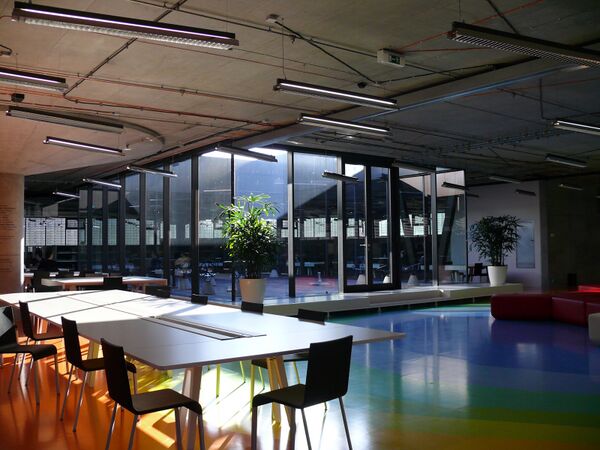 В интерьере доминирует большой атриум с прямоугольным планом. Бетонные стены украшены рисунками румынского художника Dan Perjovschi.