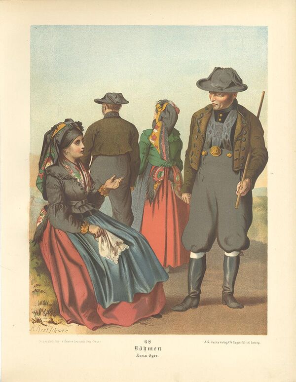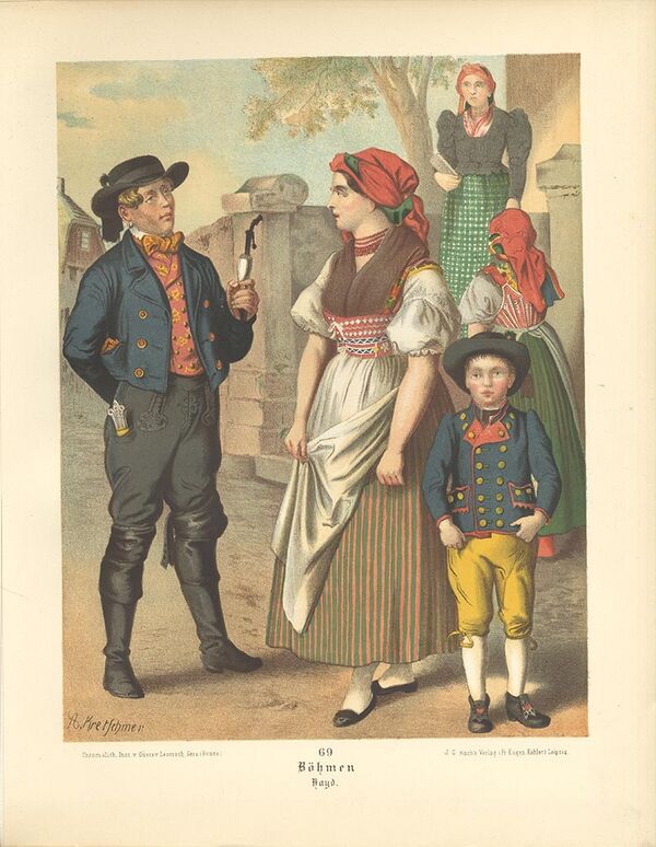 В историческом регионе Прахеньско (Южная Чехия) одежда зависела от возраста того, кто её носил. Типичная одежда молодого парня состояла из короткого жакета, узких брюк и высоких сапог. Женатые мужчины носили вместо жакетов долгополые кафтаны (чеш. kabat). Женские костюмы для молодых и старших женщин тоже отличались. Незамужние девушки. Замужние женщины носили длинные юбки, которые показывали их статус, а на голове — белую повязку или чепец.