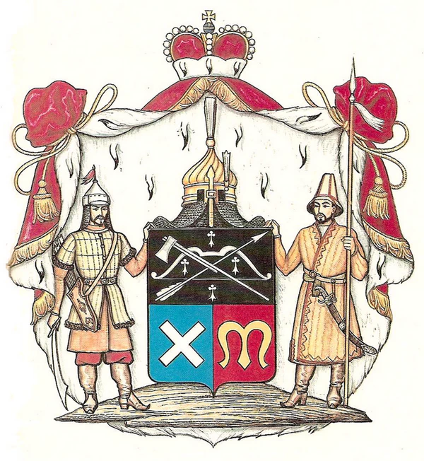 Щит увенчан булатным шишаком Чингисхана с золотыми украшениями и с двумя серебряными перьями. Вместо Намёта кольчуга. Щитодержатели: правый — монгол в стёганой одежде и такой же шапке, с колчаном, опирается правой рукой на саблю. Левый — киргиз (казах) в шляпе с саблей держит в левой руке копьё. Герб украшен красной, подбитой горностаем мантией с золотыми кистями и бахромой и увенчан княжеской короной. Герб князей Чингисов внесён в Часть 12 Общего гербовника дворянских родов Всероссийской империи, стр. 12.