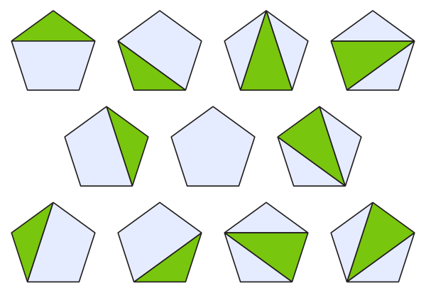 - n-ое число в последовательности подсчитывает число различных способов разбиения многоугольника с n + 1 сторонами на меньшие многоугольники путём добавления диагоналей в исходный многоугольник.