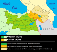 Карта раздела Великой Армении между Османской и Персидской империями. Указаны шесть армянских провинций Османской империи (Западная Армения) и области Восточной Армении, отошедшие к России в XIX веке, включая области, компактного проживания армян |