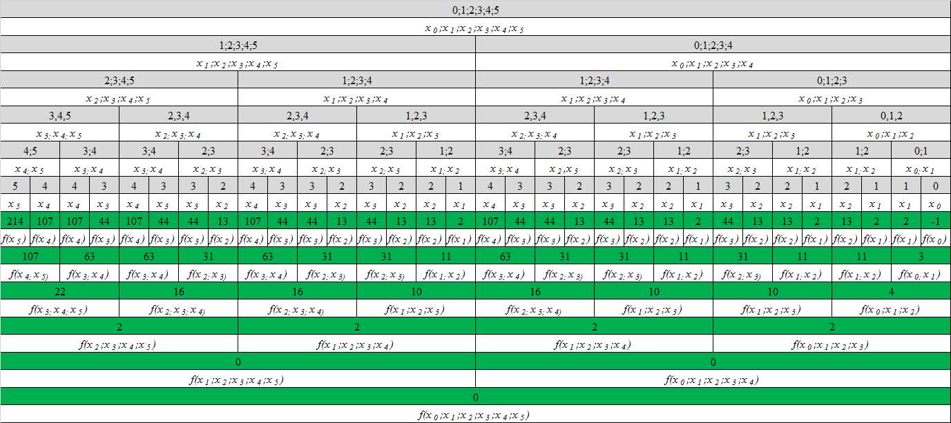 Следующим шагом является введение понятия разделённой разности -го порядка на базе отношений разности значения функции в соседних узлах к расстоянию между узлами, которая в силу своего определения обладает рядом полезных свойств, в частности разделённые разности порядка от многочлена степени имеют степень , то есть разности порядка постоянны, а разности более высокого порядка равны [15]. Разделённые разности позволяют переписать интерполяционный многочлен Лагранжа в виде, более удобном для вычислений. Новая формула носит название интерполяционного многочлена Ньютона[16], в случае равных промежутков формула значительно упрощается[17]. С использованием разделённых разностей строятся интерполяционные формулы Гаусса, Стирлинга, Бесселя, Эверетта[18]. В общем случае разделённые разности сначала убывают с повышением порядка, а затем начинают снова расти, иными словами, нет смысла использовать разности высоких порядков в вычислениях[19]. При этом возникает вопрос сходимости интерполяционного процесса, для решения которого привлекаются различные методы математического анализа[20].