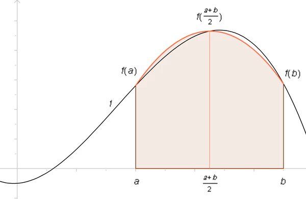 В случае интегрирования, само определение интеграла говорит о возможности его замены интегральной суммой, но этот приём обладает медленной сходимостью и мало пригоден. Интеграл от основной функции считают приближённо равным интегралу от интерполирующей функции и в дальнейшем используют интерполяционные формулы с кратными узлами[39]. Использование в качестве подынтегрального выражения интерполяционного многочлена Лагранжа для равных промежутков приводит к формулам Ньютона — Котеса[40] и её частным случаям, формуле трапеций, когда кривая подынтегрального выражения заменяется хордой и интеграл равен площади трапеции, и формуле Симпсона, когда кривая подынтегрального выражения заменяется параболой, проходящей через три точки[41]. Отказавшись от требования равных промежутков с помощью интерполяционного многочлена Лагранжа можно получить более точные формулы численного интегрирования, в частности формулы Гаусса[42], формулы Эрмита[43], формулы Маркова[44], формулы Чебышёва[45]. Квадратурные процессы, построенные на интерполяционных формулах Гаусса, всегда сходятся, в то время как формулы Ньютона — Котеса этим свойствам в общем случае не обладают[46].