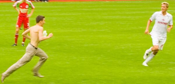 Если на поле, без разрешения судьи появляется постороннее лицо, официальное лицо, удалённый или запасной игрок, игра должна быть остановлена, если это лицо мешает игре. В момент остановки судья должен вынести дисциплинарное взыскание и удалить нарушителя с поля. Если это постороннее лицо — игра должна возобновиться свободным ударом, если это лицо из протокола — штрафным или 11-метровым ударом[5].