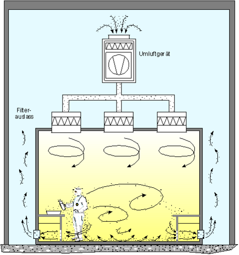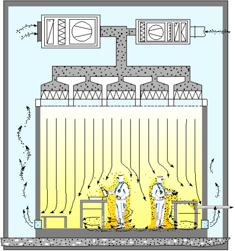 Для уменьшения загрязнения в чистых помещениях высокого класса применяются специальные системы вентиляции, при которых поток воздуха движется сверху вниз без турбулентностей, то есть ламинарно. При ламинарном потоке воздуха частицы грязи от людей и оборудования не разлетаются по всему помещению, а собираются потоком у пола.