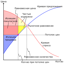 Если рынок представляет собой совершенную конкуренцию, производители будут устанавливать цену в размере 10 копеек, а каждый покупатель, чья предельная выгода превышает 10 копеек, будет покупать гвоздь. Монополист на рынке обычно устанавливает такую цену, которая принесет ему наибольшую прибыль, несмотря на потери эффективности экономики в целом. Например, производитель-монополист берет 60 копеек за гвоздь, тем самым исключая всех покупателей с предельной выгодой менее 60 копеек. В таком случае чистые издержки монопольного ценообразования будут представлять собой экономическую выгоду, неполученную клиентами, чья предельная выгода находится в интервале от 10 до 60 копеек за гвоздь. Монополист изгнал этих покупателей с рынка, хотя выгода этих покупателей превышала истинную стоимость гвоздя[3].