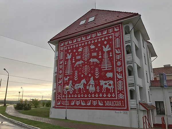 - Мурал на стене офисного здания ОАО "Забудова". Художник изобразил белорусский орнамент с сюжетом на бытовую тему из сельской жизни