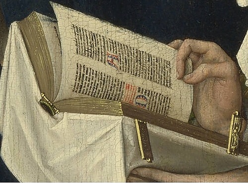 Книга, в чтение которой погружена Магдалина, может быть Библией[3] или часословом, который в Средневековье часто использовался для домашней молитвы, в том числе женщинами[19]. На раскрытой странице хорошо виден написанный в две колонки текст с большими цветными инициалами. Книга богато украшена: обрезы позолочены, а переплёт не только снабжён золотыми застёжками, но и обёрнут специальной тканью, служащей для его защиты[3]. При увеличении различимы разноцветные (красная, синяя и две зелёных) закладки в виде нитей, прикреплённых к золотому стержню у корешка, и тонкая красная разлиновка внутри рукописного текста[20].