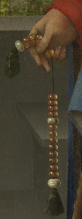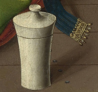 На полу слева от Магдалины стоит алебастровый сосуд с миром: традиционный атрибут святой. Отбрасываемая им тень касается расшитого золотом кончика пояса, чья роскошь подчёркивает строгую простоту этого предмета-символа. Белый цвет алебастра перекликается с белизной головного убора и ткани, в которую обёрнута книга; пятна белого, образуя легко читаемый треугольник, придают композиции целостность и смысловое единство[3][14].