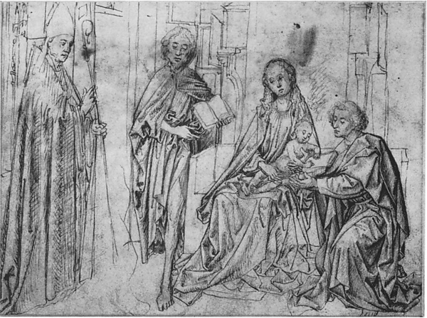 На стокгольмском рисунке изображена Дева Мария с Младенцем Христом на коленях, сидящая перед камином на деревянной скамье[23]. Справа — коленопреклонённый Иоанн Евангелист; в руках у него чернильница и раскрытая книга, в которой пишет Младенец (вероятно, аллюзия на богодухновенность Евангелия)[43]. Слева — Иоанн Креститель, также с книгой в руках, и неизвестный епископ, воздевший руку в благословляющем жесте[3][35][43]. Пространство вокруг — не храм, а домашний интерьер (изображение сакральных сцен в подобной камерной обстановке было характерно для Робера Кампена)[40][39]. Фигура Марии находится не строго по центру, что заставляет исследователей видеть в рисунке изображение не всей композиции, а лишь её части[43]. Кроме того, между фигурами Иоанна Крестителя и епископа имеется зазор, в котором угадываются едва намеченные очертания ещё одного персонажа[23][41]. Фигура Магдалины на стокгольмском рисунке отсутствует, однако при его сопоставлении с картиной из лондонской галереи очевидно, что поза коленопреклонённого Иоанна и положение скамьи, на которой восседает Мария, соответствуют взаимному расположению деталей в «Читающей Магдалине»: босой ноги, фрагментов красной мантии и деревянной конструкции на заднем плане у окна[23][41]. Уорд отмечает некоторое несоответствие пропорций и подчёркивает, что стокгольмский рисунок передаёт лишь общий характер композиции, допуская ряд неточностей в расположении персонажей относительно деталей фона[44]. Историк искусства Стефани Бак (Stephanie Buck) также отмечает эскизный характер, неравномерную проработанность и явную незавершённость рисунка[45]. Тем не менее на его основе возможно заключить, что фрагмент с Магдалиной и Иосифом находился в правой части алтарного образа[44][3].
