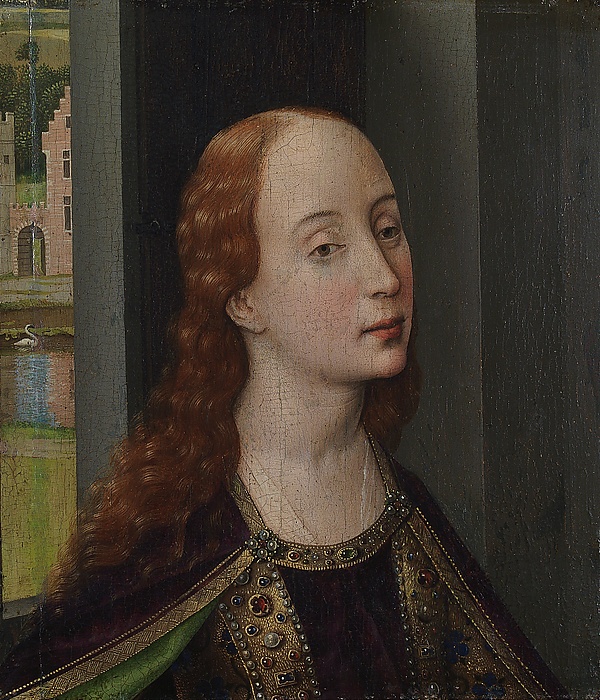 В собрании лиссабонского музея имеется ещё одна картина ван дер Вейдена приблизительно того же размера, что и «Святой Иосиф» (около 21 × 18 см), написанная на доске такой же толщины и попавшая в музей одновременно с ним. По всей видимости, она также является фрагментом утраченного алтарного образа[47]. Изображённая на ней святая в богатых одеждах — предположительно Екатерина Александрийская — стоит или сидит на фоне окна, за которым виднеется пейзаж с рекой и лебедем[43][47]. Поскольку река должна располагаться на том же уровне, что и во фрагменте с Магдалиной, вероятнее всего, что святая была изображена стоящей на коленях[34]. Исходя из того, что центр всей композиции — фигура Мадонны с Младенцем, Уорд предполагает, что по обе стороны от неё должно было находиться равное количество персонажей[48]. На стокгольмском рисунке святая Екатерина отсутствует, однако, сопоставив все имеющиеся фрагменты, Уорд приходит к выводу, что её коленопреклонённая фигура располагалась между Иоанном Крестителем и епископом слева, отчасти перекрывая фигуру последнего[49].