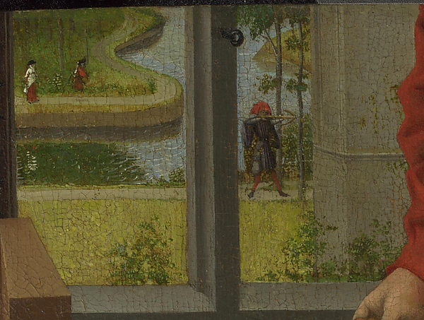 Лорн Кэмпбелл считает, что, в частности, образ Магдалины сложился под влиянием фигуры Девы Марии из брюссельской версии «Благовещения» (центральной части «Алтаря Мероде») Флемальского мастера[27][28]. В сцене Благовещения евангельская сцена также перенесена в интерьер, воспроизводящий нидерландское жилище XV века, а фигура Марии вписана в такой же символический полукруг, подчёркивающий её отрешённость и погружённость в чтение[27].