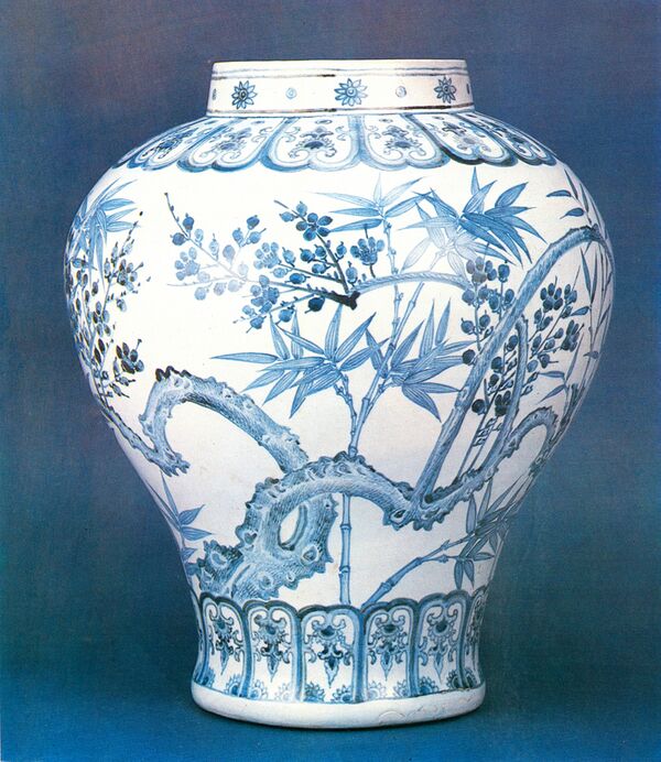 Бело-голубая керамика, украшенная росписями, для которых использовался натуральный кобальтовый пигмент, была также популярна в период Чосон. Многие из этих предметов были созданы придворными художниками, нанятыми королевской семьёй. В этот период популярный стиль пейзажной живописи находит своё отражение в отделке керамики[36]. Первоначально разработанный китайцами в печах Цзиндэчжэнь в середине XIV века, такой фарфор начал производиться в Корее. В 1463 году, когда собственные кобальтовые месторождения были открыты в Корее, художники обнаружили, что корейский кобальт был менее качественным и предпочли использовать более дорогой импортный кобальт. Корейский фарфор с импортным кобальтовым декором противоречил общему акценту на упорядоченную, бережливую и умеренную жизнь согласно неоконфуцианскому учению.[36].