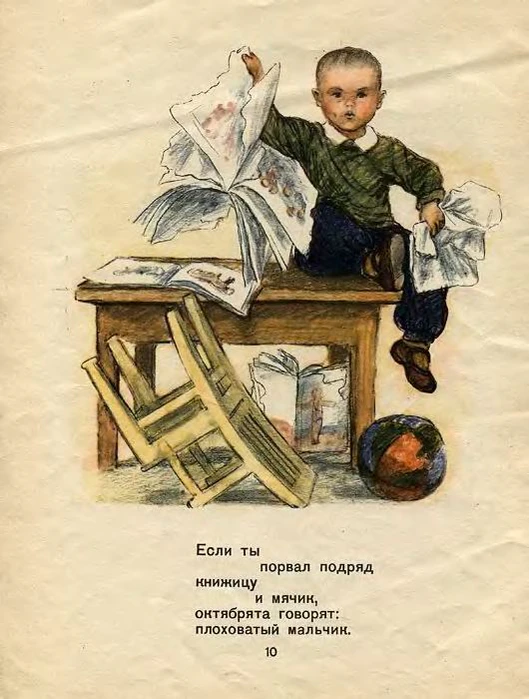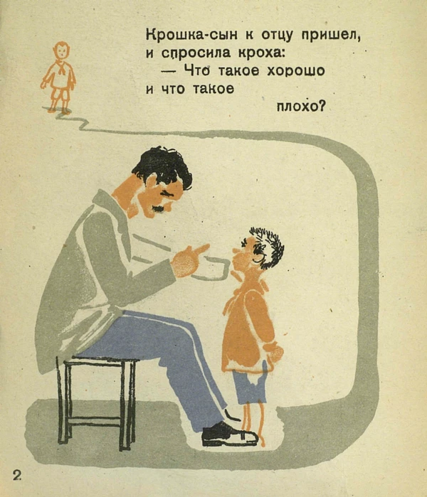 Эту книжку можно бы принять всерьёз и взять её катехизические тенденции, данные парами — в положительном и в отрицательном смысле — за лозунги поведения современного дошкольника, если бы не приходили в голову уроки поведения, преподаваемые в детских книгах со времён XVIII века в виде ответов родителей и наставников на вопросы благонамеренных детей. Но всё же смысл её не в пародии, а в самой лаконической формуле ответов и в конструкции всего текста. Здесь всё от современности: размер и ритм частушки, лаконизм, обобщённость и безличность плаката.