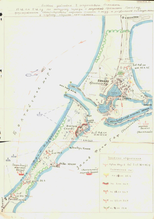 С 18 часов 25 апреля 1945 года 3-й стрелковый батальон 17-го гвардейского стрелкового полка гвардии майора Дорофеева А. В. в составе передового отряда десанта на автомобилях-амфибиях под непрерывном огнём противника форсировал пролив Зеетиф, соединяющий Балтийское море с заливом Фришес-Хафф, и высадился на косе Фрише-Нерунг. Батальон захватил плацдарм, отразил две контратаки противника и обеспечил успешную высадку второго эшелона батальона во главе с гвардии капитаном Чугуевским, отбил три контратаки противника, пленил около 480 немцев и обеспечил высадку остальных сил десантов полка подполковника Банкузова А. И. Батальон перерезал косу и соединился с десантом моряков Балтийского флота. В результате отступающие из Пиллау немцы (более 6000 человек) были отрезаны от основных частей и впоследствии капитулировали.
