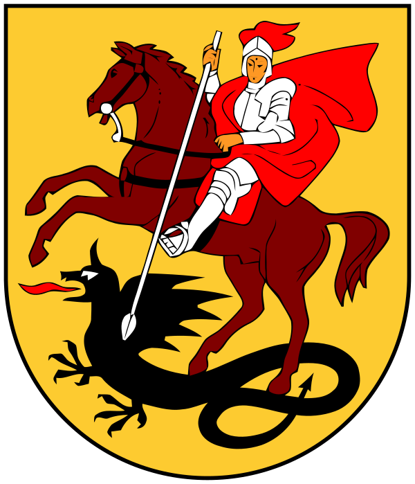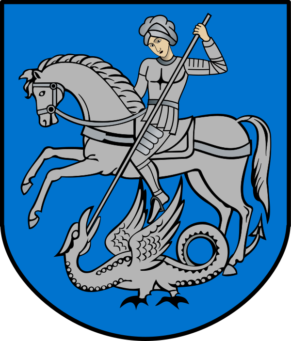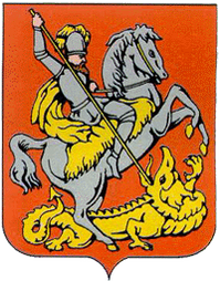 «Герб города Москвы представляет собой изображение на темно-красном геральдическом щите с отношением ширины к высоте 8:9 развернутого вправо от зрителя всадника — Святого Георгия Победоносца в серебряных доспехах и голубой мантии (плаще), на серебряном коне, поражающего золотым копьем чёрного Змия»[16]