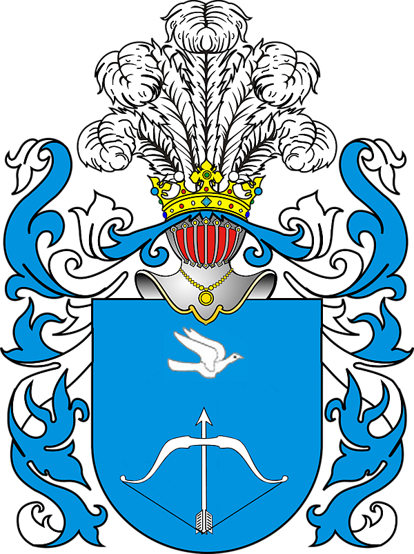 Описание герба: в поле лазоревом лук со стрелою серебряные стрелою вверх, а вверху птица серебряная. Нашлемник: пять павлинных перьев. |