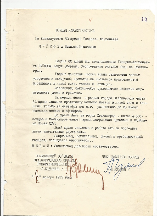 В самые критические периоды защиты Сталинграда войска В. И. Чуйкова не только выстояли в непрерывных боях, но и приняли активное участие при разгроме немецких войск на завершающем этапе Сталинградской битвы (17 июля 1942 — 2 февраля 1943). Оборона Сталинграда длилась 200 страшных и кровопролитных дней и ночей.