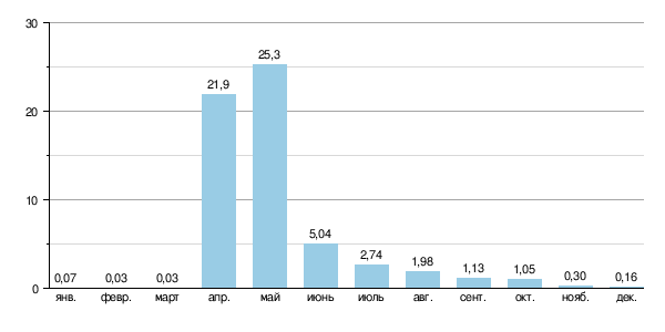 - Максимальный расход воды приходится на апрель-май и соответствует периоду таяния снежного покрова.