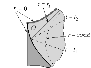 С физической точки зрения известны механизмы, которые могут приводить к тому, что некоторая область пространства-времени будет иметь те же свойства, что и соответствующая область у чёрной дыры. Так, например, в результате коллапса звезды может сформироваться пространство-время, показанное на рисунке. Изображённая тёмным цветом область заполнена веществом звезды и метрика её определяется свойствами этого вещества. А светло-серая область совпадает с соответствующей областью пространства Шварцшильда (см. рисунок выше). Именно о таких ситуациях в астрофизике говорят как об образовании чёрных дыр, что с формальной точки зрения является некоторой «вольностью речи»[Комм 4]. Снаружи через некоторое время этот объект станет практически неотличим от чёрной дыры по всем своим свойствам, поэтому данный термин применим к получающейся конфигурации с очень большой степенью точности[47].