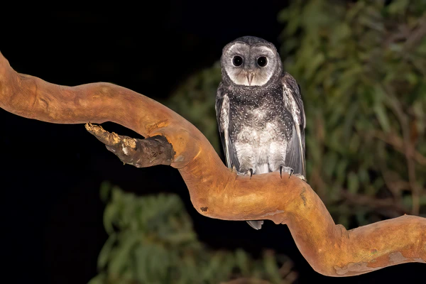 Основное оперение птицы — пепельно-чёрное; на округлом лицевом венчике, цвет которого варьируется от светло-серого до графитового (от светлых краёв постепенно темнеет к середине), расположены очень большие чёрные глаза.