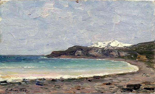 На картине представлен морской залив, занимающий левую часть композиции, тогда как справа располагается подковообразная полоса суши. В глубине изображены заснеженные горные вершины, подчёркивающие пространственную глубину пейзажа. Над всем пространством простирается чистое голубое небо, что придаёт изображению ощущение ясности и спокойствия, характерное для произведений в жанре марины.