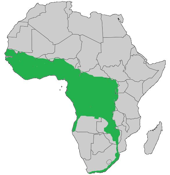 Обитает в Западной и Центральной Африке[4] от Сенегала и Габона (на западе) до Эфиопии и Сомали — на востоке (кроме Эритреи), от Нигера и Чада (на севере) до Анголы, Зимбабве, Замбии и Мозамбика — на юге.