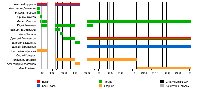 - Михаил Светлов — гитара (1986, 1987—1988, 1990, 1999—наши дни)