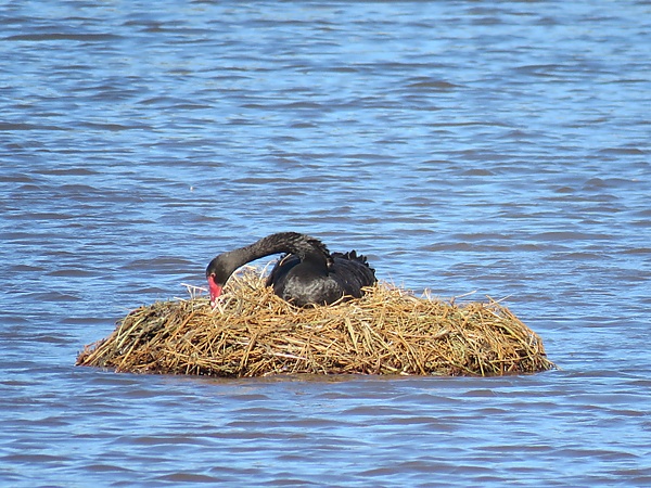 В Южном полушарии чёрные лебеди обычно гнездятся в более влажные зимние месяцы (с февраля по сентябрь), иногда большими колониями. Гнездо представляет собой большую кучу тростника, трав и водорослей диаметром 1–1,5 м и высотой до 1 м, расположенную на мелководье или островках[2][10]. Гнездо используется ежегодно, при необходимости восстанавливается или перестраивается. Оба родителя заботятся о гнезде. В кладке обычно 4–8 зеленовато-белых яиц, которые насиживаются около 35–40 дней[29]. Насиживание начинается после откладывания последнего яйца, чтобы синхронизировать вылупление птенцов. До начала инкубации родитель сидит над яйцами, не согревая их. Оба пола насиживают яйца, при этом самка насиживает ночью. Смена родителей сопровождается ритуализированными демонстрациями. Если яйца случайно выкатываются из гнезда, оба родителя возвращают их шеей (у других видов лебедей это делает только самка). Как и все лебеди, чёрные лебеди агрессивно защищают гнёзда крыльями и клювом. После вылупления птенцы находятся под опекой родителей около девяти месяцев до оперения[2][5]. Птенцы могут кататься на спине родителей при дальних переходах в глубокую воду, но чёрные лебеди делают это реже, чем немые и чёрношейные лебеди.