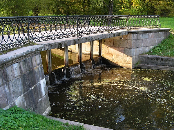 Плотина под мостом представляла собой ряд щитов, вставляемых в пазы вертикальных стоек под мостом. Их поднимали или опускали для регулировки уровня воды в реке.